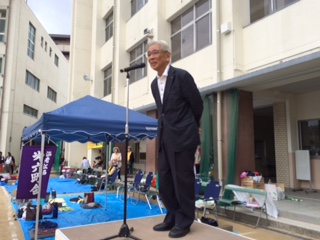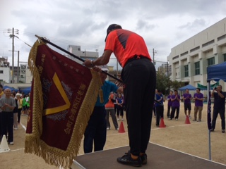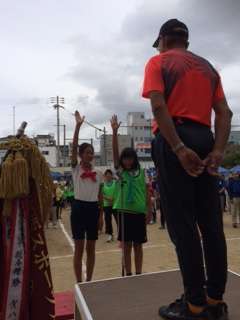 ご来賓の吉崎区社協会長様のご挨拶、トロフィー返還(去年は7町会が優勝でした。)に続いて、選手宣誓は児童代表6年生の末藤さんと塩見さんです。