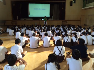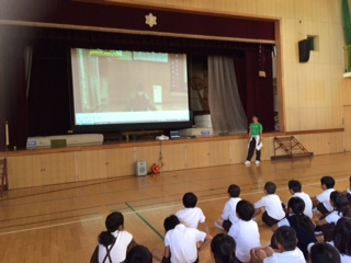 全校児童が講堂に集まり、体育主任の説明を聞きながら、跳び箱運動のDVDを見て学習しました。