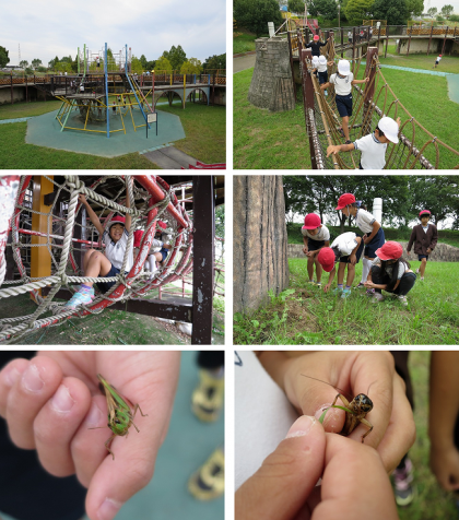 公園に着くと、まずは砦広場でおもいっきり遊びました。大きなバッタをたくさんつかまえる子も。