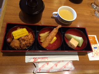 メニューは、エビフライと唐揚げ、スパゲティ、フライドポテト、ゆでとうもろこし、コーンポタージュ、デザートにケーキとメロンです。