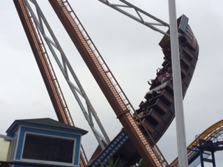 叫びながら、手を上げてスリルを楽しんでいるようです。顔は引きつっているのかな?