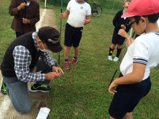 釣り師の方に、エサのごかいを釣り針につけてもらっています。