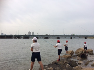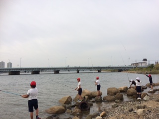 釣り竿を右手に、エサのついた釣り糸を左手に持ち、川辺にゆっくりと降りて行きます。