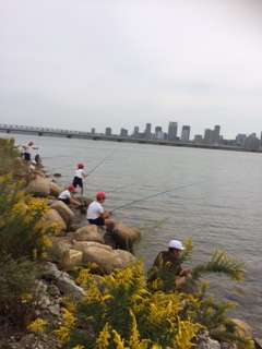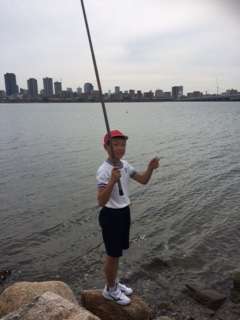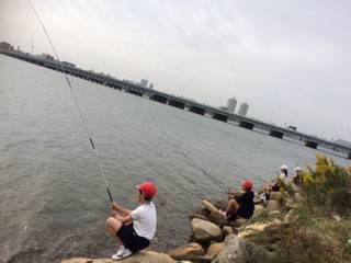 5年生は、岩場に腰を下ろして、魚がかかるのを待ちます。