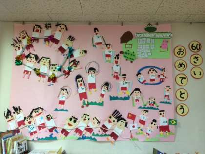 下の写真は、園児が作成した、お祝い壁面アートです。
