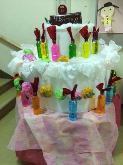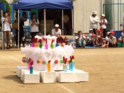 運動会親子演技で、バースディケーキを作り、お祝いの気持ちを親子ダンスで表しました。