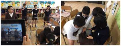 6年生と同じように、4年生もタブレットを使って自分達の演技を撮影しました。動きや声の大きさがうまくできているかすぐに確認でき、練習に活かす姿が見られました。