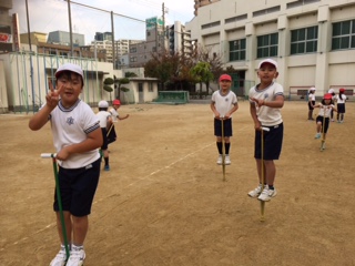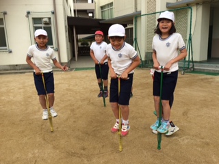 ホッピングの使い方や片付け方を担任の先生が指導された後、いよいよ練習開始です。