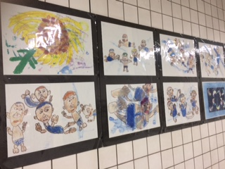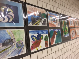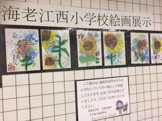 福島区役所が、町のにぎわいづくりの一環として、JR海老江駅の壁面に、福島区内の小学校、中学校、幼稚園の子ども達の絵画作品を順番に展示してくださっています。