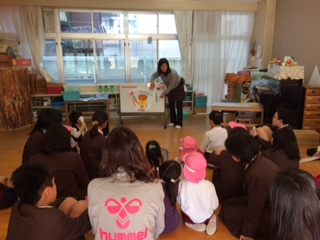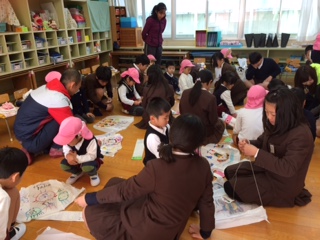 6年生が年少さくら組と年長まつ組の子ども達とペアを組みました。事前に、園児が凧に絵を描いていたので、6年生はタコ糸を結ぶのとセロテープを貼るお手伝いをしました。