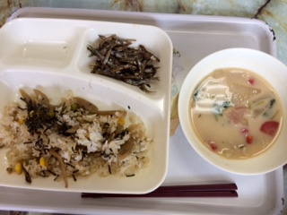 きんぴらちらし、雑煮、ごまめ、牛乳です。とっても美味しかったです!