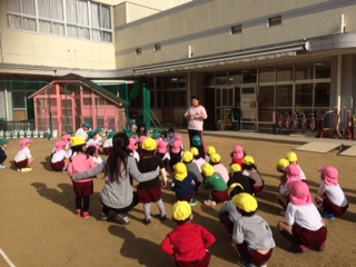 風が冷たく、最高気温も7度と、厳しい寒さの中、幼稚園のまつ組、さくら組、未就園のたんぽぽ組の子ども達が、運動場で元気よく走っています。