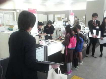瞬時に郵便番号を読み取り、それぞれの地域に振り分ける大きな機械を間近で見せてもらいました。また、郵便物に危険物が入っていないか、X線で調べる機械も見せてもらいました。最後に自分たちの書いたはがきを窓口で渡しました。