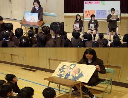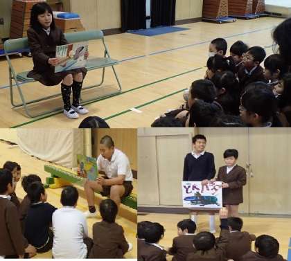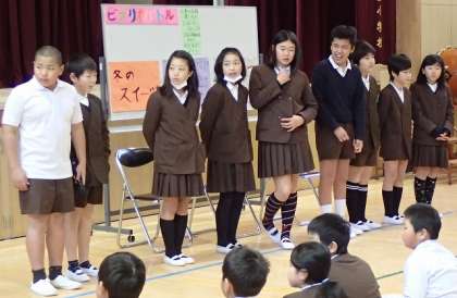 今日の児童集会では図書委員会の発表がありました。図書委員の人たちは、みんなに本を好きになってもらおうと企画した「冬の日の読書週間〜本を読んで心もあったまろう〜」を終えたばかりです。「読書ゆうびん」や「本の処方箋」などのアイデアあふれる取り組みで、みんなに読書の楽しさを再発見させてくれました。その3週間にわたった活動の総まとめとして、今日の発表をしてくれました。5つの「絵本コーナー」で楽しい読み聞かせをしてくれたり、「ビブリオ・バトル」のコーナーでは、3人の委員がおすすめの本の紹介合戦をしてくれたりで、みんなはそれぞれのコーナーに集まって大喜びでした。やっぱり本が好き!