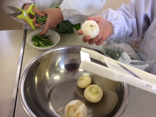 3年生は学習園で育てた伝統野菜ー田辺大根と天王寺かぶらーを使って、家庭科室でお漬物を作りました。栄養教諭も事前指導と当日の授業を担任と一緒に行いました。
