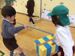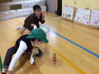 園児は、昨日、授業体験で組んだペアの1年生に遊び方を教えてもらいながら、遊びコーナーを回りました。