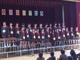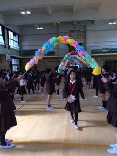 たてわり班で作った首飾りを講堂入口で1年生につけてもらい、花のアーチをくぐって、6年生が入場してきました。