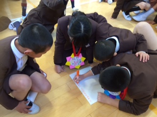 はじめに、6年生と伝言ゲームをしました。1年生から順に6年生へと、言葉を送ります。最後の6年生は、聞いた通りに用紙に記入しました。なかなか正確に伝えるのは難しいですね。