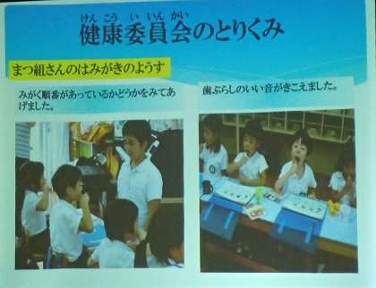高学年児童と小学校と幼稚園の保護者が参加して、恒例の学校保健委員会が開かれました。今年のテーマは「歯みがき大事!歯ブラシ大事!」です。はじめに健康委員会児童による活動報告がありました。歯ブラシについてのアンケートをグラフにまとめたり、幼稚園での歯みがき見守り隊の様子をわかりやすく報告してくれました。歯のみがき方や歯ブラシのチェックの仕方がとてもためになりました。次に大阪市学校歯科医会理事の普光江暁先生に講演していただきました。「子どもの歯を守る懇談会」というテーマで、歯周病が人間の身体にどんな悪い影響を及ぼすのかをわかりやすく教えていただきました。知らない間に忍び寄る歯周病。放っておくと、歯を失うだけではなく命さえも失ってしまうこともあるのだそうです。それを防ぐには毎日の正しい歯みがきが一番有効だそうです。子どもも大人も、もう一度歯みがきについて振り返り、これからもがんばって歯をみがこうという思いを新たにした委員会でした。(教務主任)