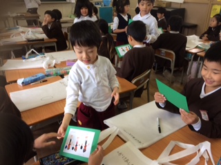 今日は、幼稚園の年長まつ組の子ども達が、1年生のクラスに来て、お礼の手紙(まつ組担任が園児から聞き取った話を添え書きしています。)を手渡しました。
