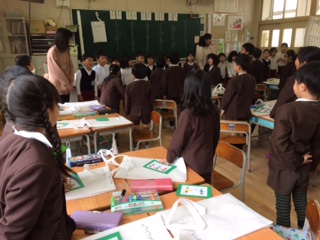 2/23 授業体験(1年生の机と椅子に座り、国語と算数の学習。自分の名前を書く、1〜5の数のお稽古。1年生が教えました。)