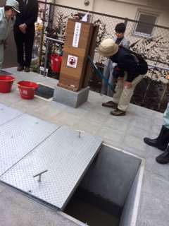 雨水を貯めて、ポンプでくみ上げ、マンホールトイレに流します。