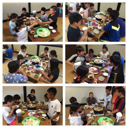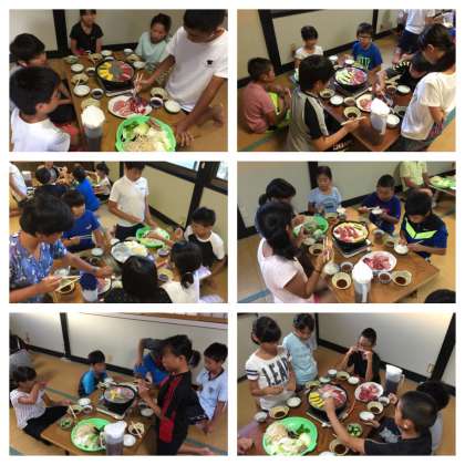 開舎式の児童代表あいさつでも登場した焼肉の夕食です。