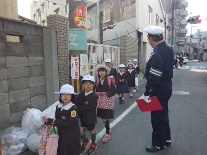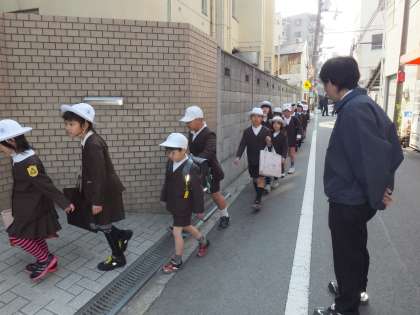 集団登校、車にきをつけてね。新しい班長さんが、下級生に優しく声をかけたり気を配ったり。頼もしいです。