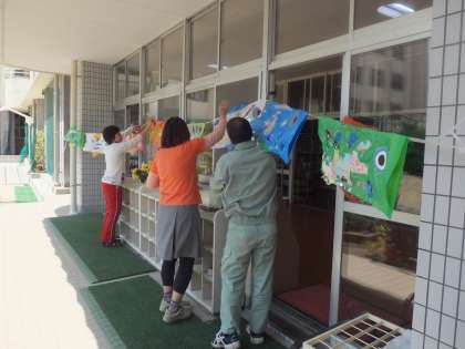 幼稚園の先生と管理作業員さんが、園児の作ったこいのぼりを