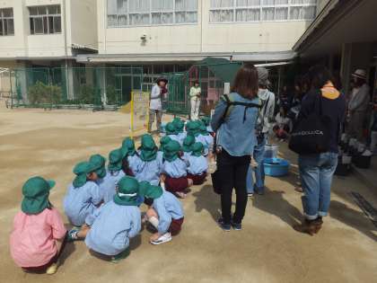 担任の先生が、苗の植え方を園児と保護者に説明しています。