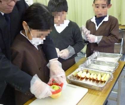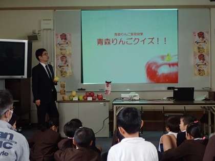 青森りんごの会の方に、青森りんごについて教えていただきました。クイズと映像を交えてのお話がとても楽しく、青森県の自然やりんご農家の人たちの工夫や苦労がよくわかりました。それを知ってから食べさせてもらった青森りんごの味は格別でした。つくる人の苦労がわかると、大切なものをいただいている気がしてとてもおいしく感じますね。