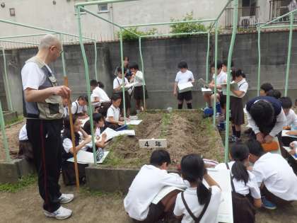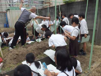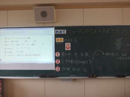 黒板を見ると「ヒョウタンの苗を観察しよう」