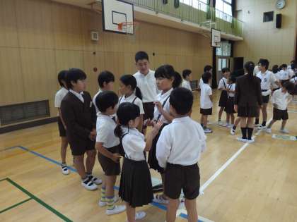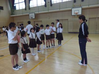 今日の児童集会では、担当の先生から、たてわりオリエンテーリングのポイントの説明をお聞きしたあと、各班の並び方とあいさつの練習をしました。