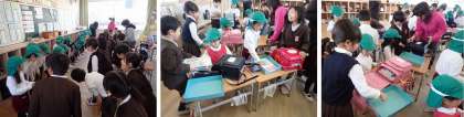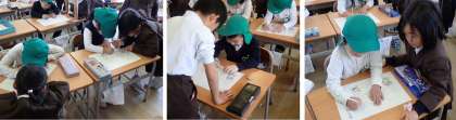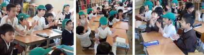 今日は併設幼稚園の園児たちが1年生の学級に授業体験に来ました。園児たちは、1年生に手伝ってもらい、初めてランドセルをかついだり、ランドセルから学習用具を出したりしてドキドキワクワクです。次に書き方練習。点線に沿ってエンピツでなぞってお絵描きした後は、色鉛筆で色ぬり。1年生の親切なお手伝いのおかげできれいにできあがりました。最後はリズムに合わせて「くだものなまえゲーム」です。園児たちはお勉強気分が味わえてご機嫌。1年生は園児たちに小学校のことを教えてあげることができて満足そうでした。少しお兄ちゃん、お姉ちゃんになった気分です。入学してきたらいっしょに遊ぼうね!