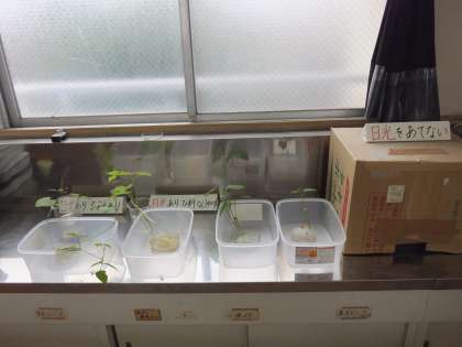 窓辺には、日光あり・なし 肥料あり・なし など、観察実験の継続中。
