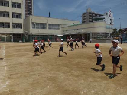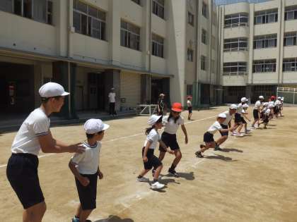初めて測定する1年生に付き添って、6年生がそばで声をかけながら走っています。