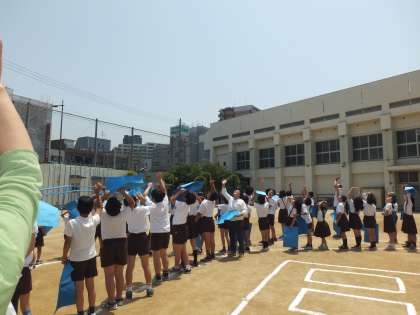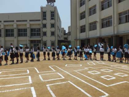 子ども達と教職員は、海西と書かれた校章のライン上に立ち、頭上に青色の画用紙を掲げました。