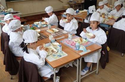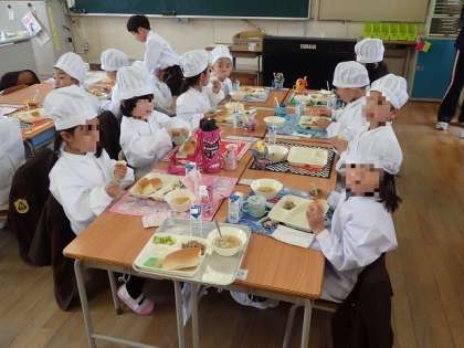 昨日は初めての給食。6年生のお兄さんお姉さんに手伝ってもらって準備しました。カレーライスがとてもおいしかったです。今日は2回目なので、準備の仕方も少しわかってきました。でもメニューの野菜スープとキャベツとピーマンのソテーはだいじょうぶかな?「おいしい!おいしい!」という子どもたちの声に安心しました。好き嫌いなく何でもおいしく食べて、勉強も運動もがんばってね。