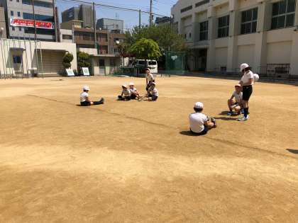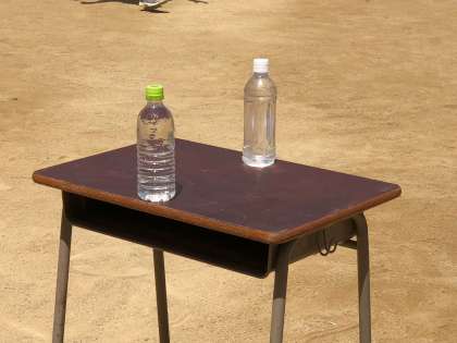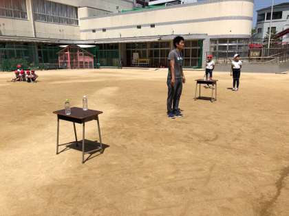 真ん中の机のペットボトルをどちらが先に倒すかを競いました。