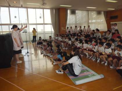 自分の歯ブラシを持って、集団歯みがきの指導をうけます。