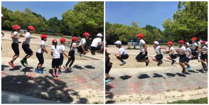 恐竜広場では、「みんなでとぼう」。みんなで大縄に挑戦!