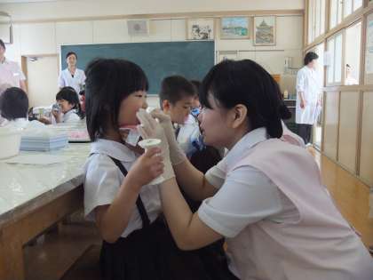 「口の中にいれますよ。」(スポンジの中にフッ素が入っています。)