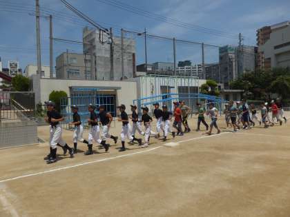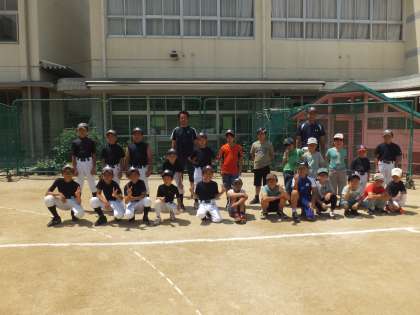 ソフトボール部のユニフォームをまとった子ども達の横に