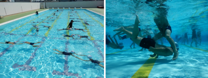 ボビングやだるま浮き、大の字浮き、けのびやバタ足練習して水慣れした後は、お待ちかねの自由遊泳タイム。