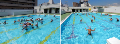 ソフトバレーボールや浮島、フラフープで遊んだり、友だちと泳いだり追いかけあいをしたり、楽しく過ごしました。