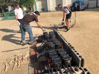 お父さん部隊は、直火はん合炊きでおいしいご飯をつくります。