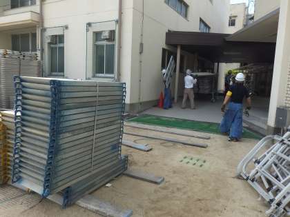 資材が運動場の隅から講堂前に積まれています。
