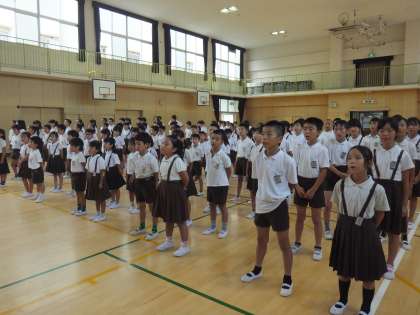市歌に続いて、「わたしのスピーチ」です。各学級1名ずつ、1学期の楽しかった思い出や頑張ったこと、2学期への抱負などを発表します。