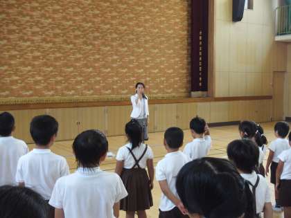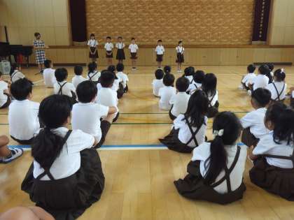 小規模校ですので、卒業するまでに、一人一回は全校児童の前でスピーチができるように、同じ子どもが発表しないようにしています。