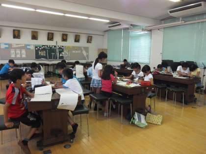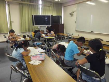夏の学習をしながら、先生にわからないところを教えてもらっています。